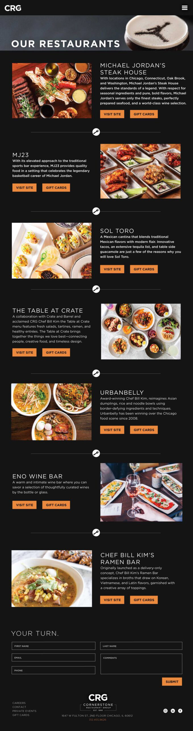 Website design for Chicago-based restaurant group, Cornerstone.