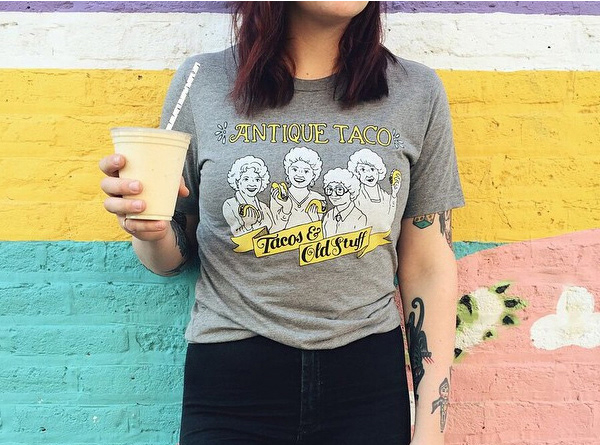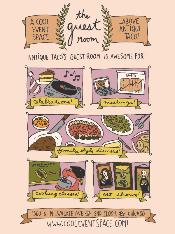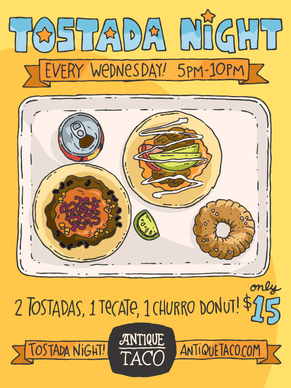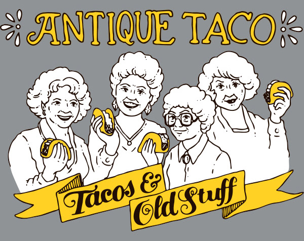 A selection of llustrations, posters, invites, and t-shirt designs for various Antique Taco promotions.